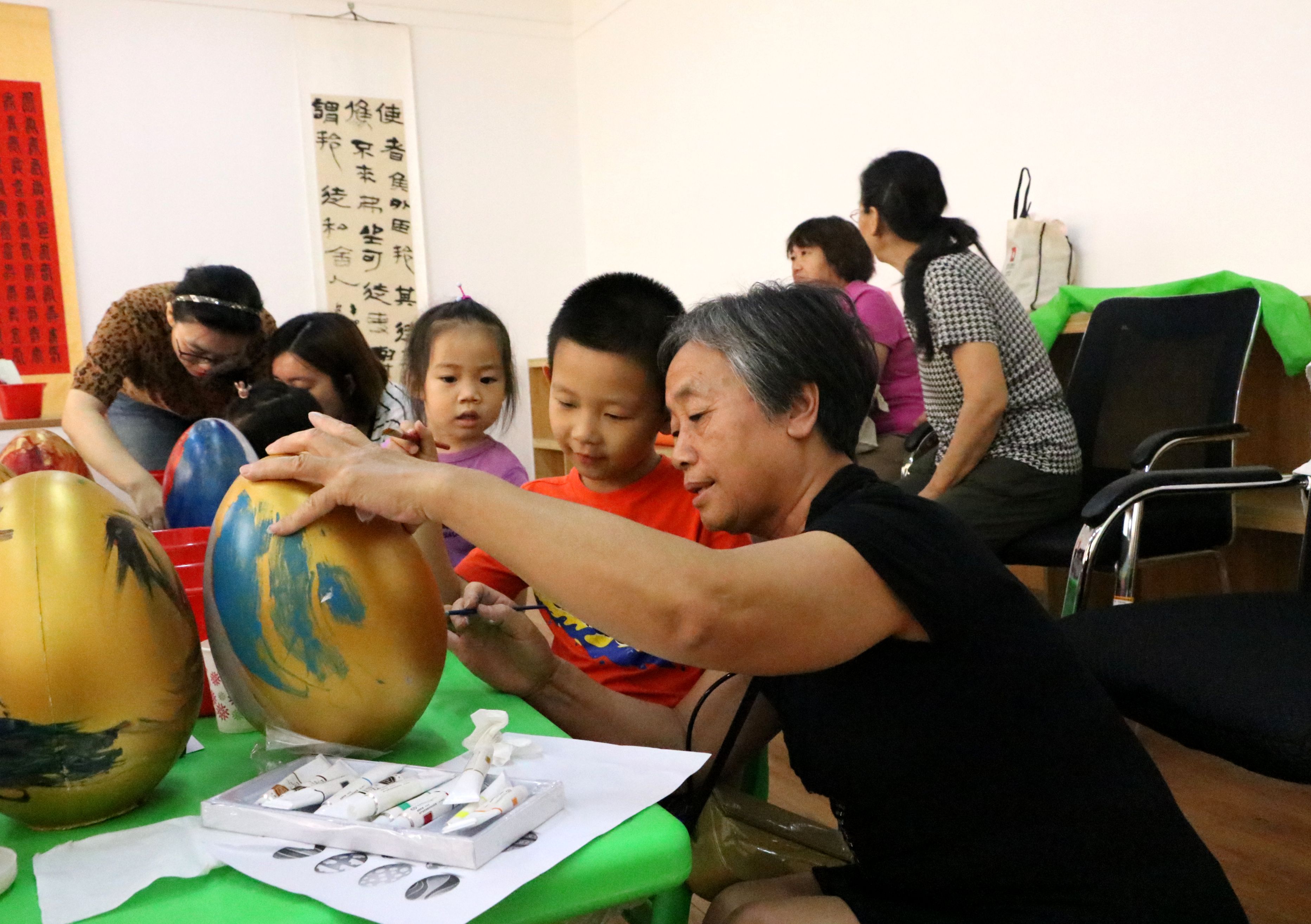 与此同时,另一边的亲子彩绘课堂正在如火如荼的开展着,小朋友们与爸爸妈妈,爷爷奶奶,姥姥姥爷齐心协力,大手握小手,在美术老师的指导下,小朋友们学会了使用画笔,如何构图,如何让作品更精美,经过一个多小时的精心作画,大家都绘出独具特色,色彩纷呈的工艺美术蛋。小朋友们在社区中度过了一个开心快乐的端午节,家长与孩子都对此次活动称赞不已。