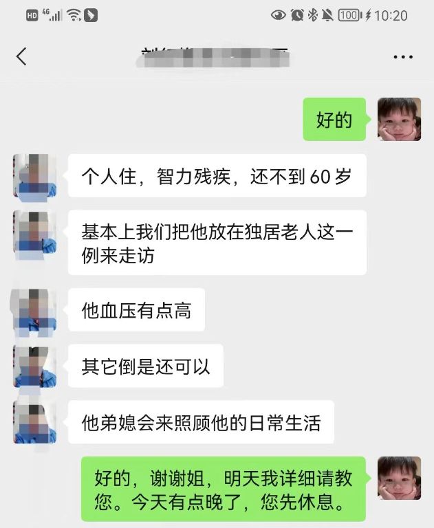 2、接案前期,通过与泺文路社区负责片区的网格员介绍,服务对象高某是一位59岁独居的智力二级残疾人,其生活照料主要靠亲属支持。对此,社工站负责困境群体帮扶工作的社工的社工及时向网格员了解服务对象自身情况及其社会支持网络,在询问后,及时随网格员到服务对象家中进行走访慰问,并与服务对象进行深入的沟通交流。我们进一步了解到,服务对象目前最紧迫的问题是生活自理能力不足。针对这种情况,社工提出可以联系亲友邻里进行照顾的方式来进行解决。后期,我们也会持续跟进,及时评估服务对象情况,链接资源进行服务工作。