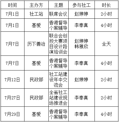 (1)7月份,趵突泉街道社工站联合社区、社区志愿者、社会慈善资源等开展活动6次;5个社区社会组织参与社区服务与治理;链接3家社会资源,约计12000元,开展活动2场;开展困难群体帮扶活动3次;社工站全员参加督导培训5次,社工站站长参加联席会议1次,机构月度例会1次。