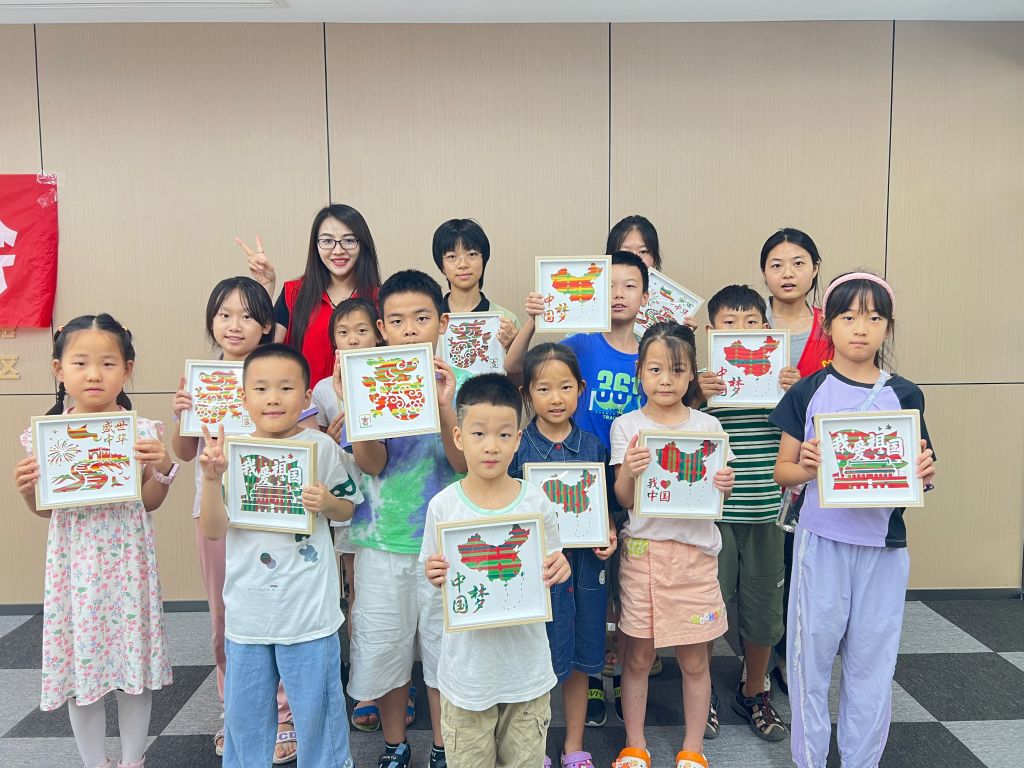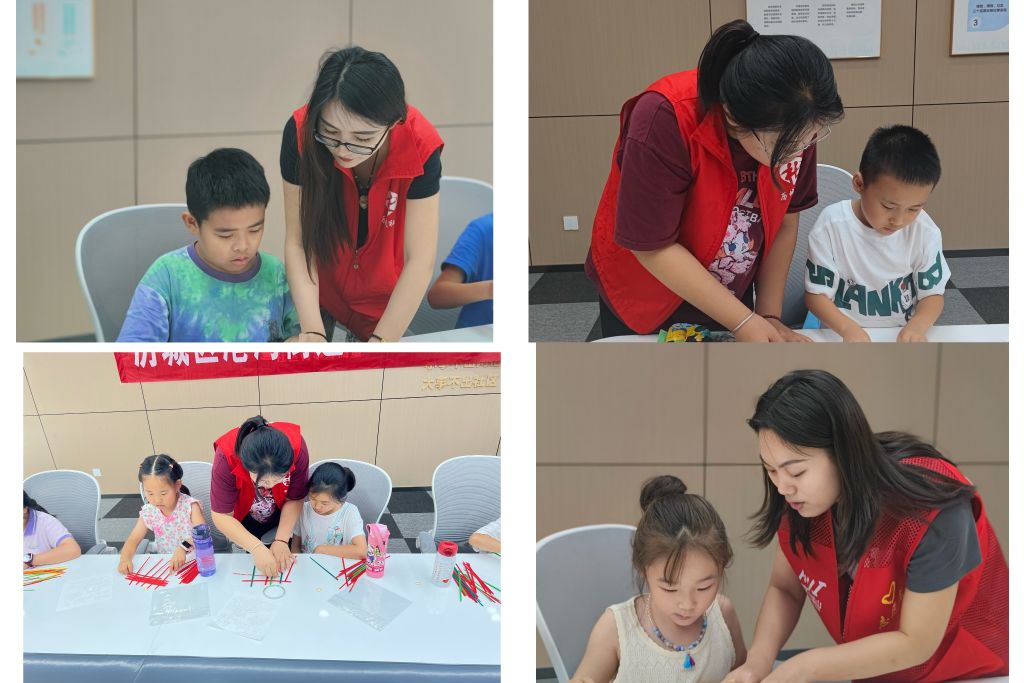 活动伊始,驻站社工向孩子们介绍了竹编画的历史渊源、技艺特点以及传承的意义,深入感受非遗“竹编”的魅力所在。随后,志愿者细致介绍竹编画的制作流程,一挑一压,将散乱的篾片编制成型,一根根竹条错落有致、紧密相连,最终将呈现一幅美丽的“画卷”。孩子们在社工及志愿者的指导下,发挥着自己的想象力和创作力,耐心专注的让竹条在手中“挥舞”,很快,一幅幅彰显爱国主题的竹编画作品呈现眼前。
