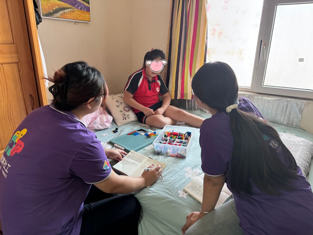 傍晚时分,社工来到叶叶家中,叶叶热情的开门向社工打招呼,十分欢迎社工的到来,叶叶母亲也表示叶叶放学时听到社工要来家里就表现得非常开心。社工们兵分两路分别与叶叶及其母亲展开了交流。