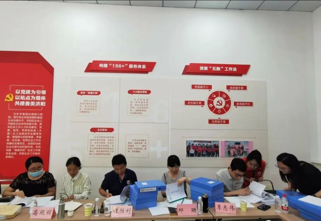 为检测各社工站的运行情况,考核任务指标的完成情况,发现工作中的困难与不足,保障社工站规范良性运行。2022年8月16日由济阳区社工总站组织评估专家对各个分站了进行现场评估,此次评估团队是由山东大学哲学与社会发展学院社会工作系教授,民政部社会事务专家委员会委员程胜利;齐鲁师范学院社会工作专业教师,副教授邱珊;山东建筑大学社会工作专业老师李志伟;注册会计师高殿丽组成。