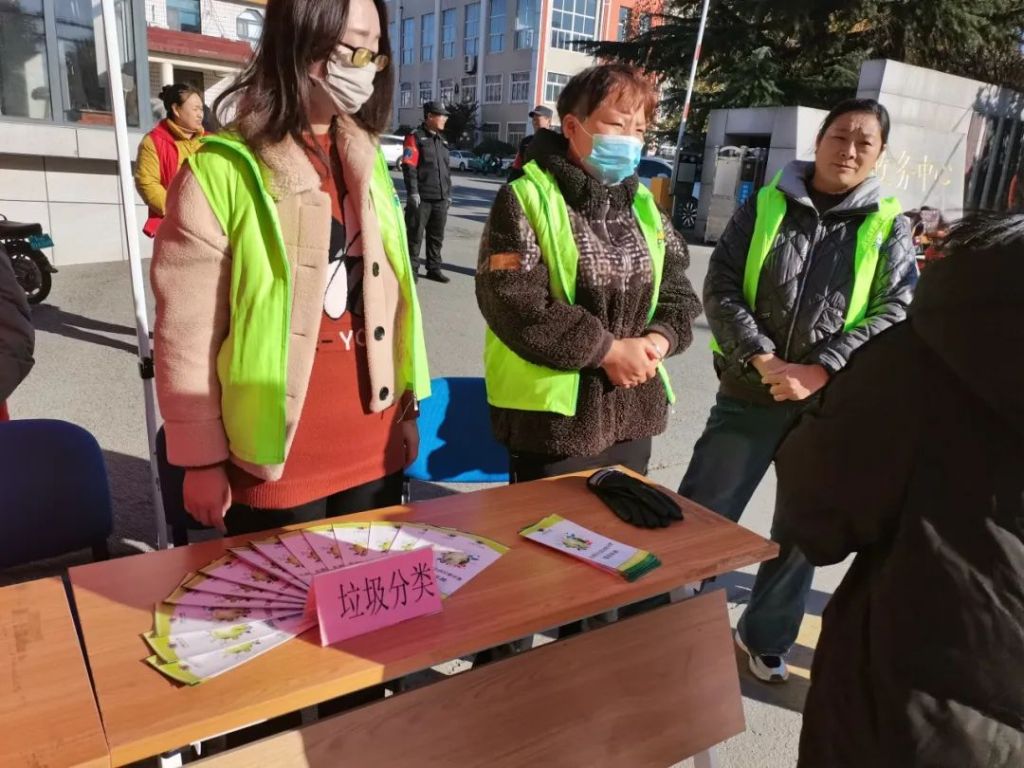 垃圾分类宣传员向居民讲解垃圾分类的方法,促使居民为保护环境献一份力。
