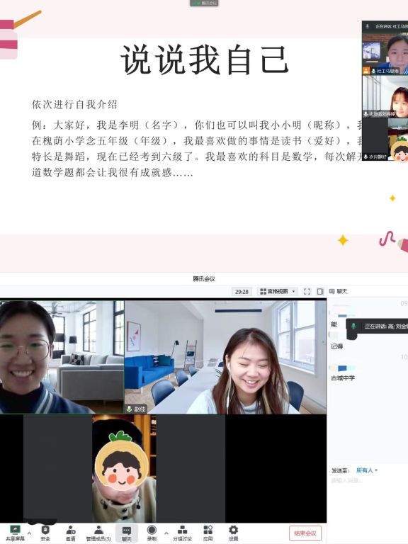 “姐姐你好,我叫小然(化名)”、“小然你好,你可以叫我末末姐姐~”。11月6日-11日,社工带着5名济南大学的志愿者同学走进了儿童家中,同时也开启了山东大学志愿者同学与儿童的线上会面通道。9对“童伴”小分队在一声声“你好”中初步认识。为打破初次相见的“冰点”,社工首先引导儿童与志愿者进行了“说说我自己”破冰环节,通过“你来比划我来猜”迅速拉近儿童与志愿者的距离。“这个是长颈鹿!对不对呀”,小然比划出了自己最喜欢的动物,志愿者也立马做出了回答...几轮比划过后,活动氛围渐入佳境,大家也通过这种轻松的方式互相了解了对方。