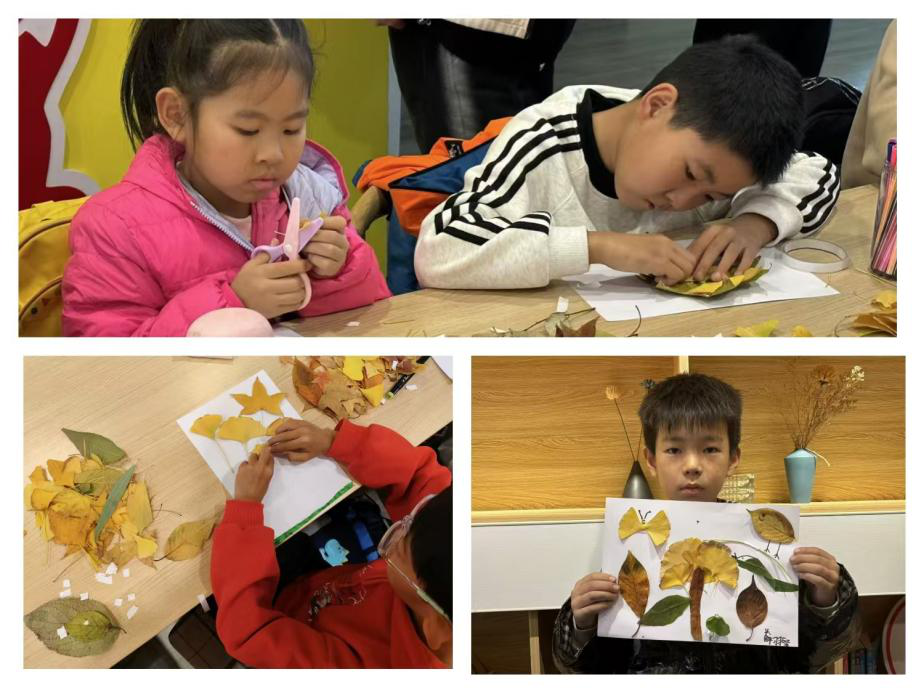兴趣活动环节是秋词对流和树叶拼贴画。志愿者提前准备关于秋天的诗词或东西词,说出某诗句的上句或者表述该词语的相关相关特征,儿童抢答。这个环节不仅锻炼孩子们的思维敏捷度,用特别的互动方式引出活动主题,也在寓教于乐中丰富孩子们的知识储备,提高反应能力。树叶拼贴环节引导孩子们用不同形状和颜色的落叶拼贴出可爱的图案,让孩子们尽情发挥自己的想象力,比如可以用银杏叶做蝴蝶的翅膀,或者用较大的枫叶做屋顶,这也培养了孩子们的动手能力与创新能力,对于秋天的魅力有了更进一步的了解与感悟。