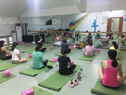 教室中,社区前来学习的居民端坐在瑜伽垫上,伴随着舒缓的音乐,大家跟随着前排教练的动作练习:吸气,向上延伸脊柱;打开双手,高举过头顶;再次深深吸气,让身体跟着呼吸延伸;呼气,慢慢放下双手……详细的讲解,舒展的动作,放松的节奏,师生们用心感受着来自瑜伽运动的魅力。