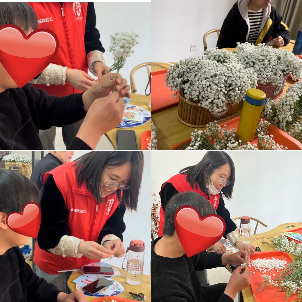 活动中,社工为残疾人们细心地讲解制作过程中的手法和需要注意的细节。在社工的鼓励下,残疾人们拿起材料开始动手制作,跟随社工的手法,一步一步,仔仔细细地完成了各自的“艺术品”,还不时地和旁边的人炫耀着自己的劳动成果。活动中他们相互帮助、积极交流,也将自己对生活的热情与热爱融入自己的手工作品中。
