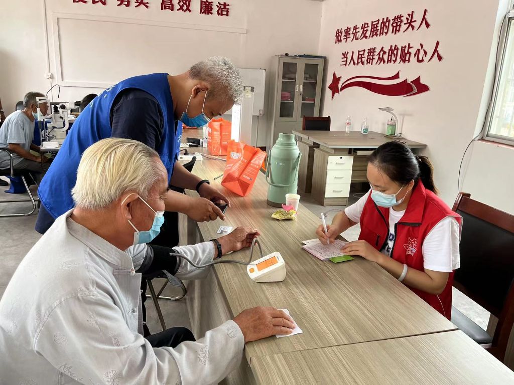 医务人员用专业仪器和设备对每位老人视力测试和白内障检测,同时社工为等待的爷爷奶奶测量血压,叮嘱血压较高的爷爷奶奶及时就医,注意饮食并定期测量血压。社工根据白内障手术救助项目明白纸详细的给老人们讲解白内障相关知识及就医政策。