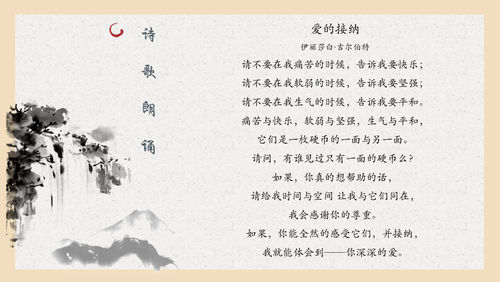 收尾环节是由小组组长带领组员做一个正念诗歌的练习——正念和朗诵的结合,是在觉察后内心声音的释放,帮助组员通过艺术疗法触发大家对自我的觉知。