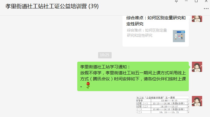 前期,社工通过站点美篇号、社区微信群及街道公众号招募37名备考伙伴。孝里街道社工站开通线上、线下双学习渠道。线上建立微信群,发布报考条件及报名流程等信息,积极做好宣传,开设线上每日学习分享环节,通过分享社工考试知识,利用碎片时间促进考生共同学习。线下开展赋能培训班,社工们制定了严密的课程表,为备考伙伴们指明了备考的方向,理清了学习思路。伙伴们纷纷表示:参加赋能训练营不仅帮助自己成功报考社工证,同时学习了答题技巧,理清了备考思路及学习方向。