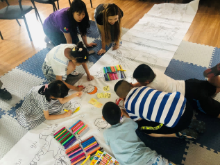 图三社工指导孩子写下“我们的约定”并在画板上作画