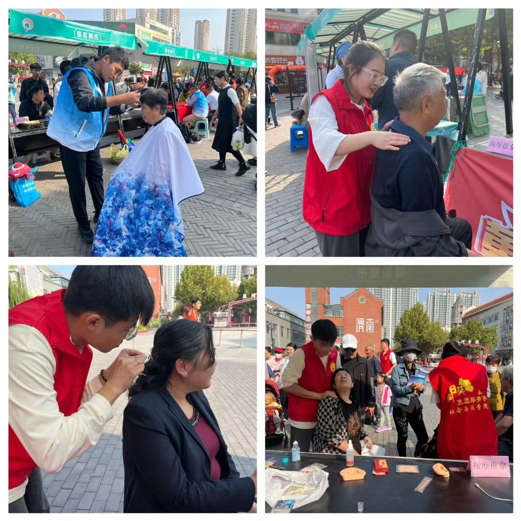 今天最受欢迎的展区非便民服务区莫属,由社工站“同心缘巾帼志愿服务队”志愿者戴阿姨及山东女子学院志愿者们负责的义卖摊位摆放的精美手工艺品引起了大家的关注,居民纷纷前来问价购买;爱心义剪的理发师技艺娴熟,大家在他的身后排起了长队,吸引了大波老年朋友前来体验;山东女子学院志愿者们为广大居民朋友带来了按摩、采耳服务,一边为老年朋友按摩一边与他们交流传授按摩技巧,现场欢声笑语不断。