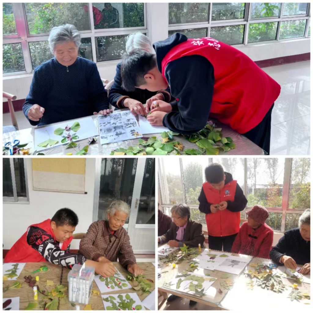 制作过程中,残疾老年人用不同的树叶,通过动脑动手粘贴成了各种各样的图案,并根据自己的想象,给画面添上一些喜欢的东西,使画面变得更加美观,有些残疾老年人行动不便,制作起来不灵活的,小志愿者们主动协助他们一起制作,本次活动不仅有助于锻炼残疾老年人的手指灵活度和空间想象能力,增强注意力,更有利于残疾老年人康复。