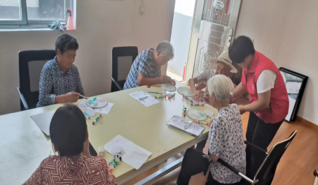 活动开始,社工首先详细介绍了团扇文化、绘制步骤、调色技巧和注意事项,之后向老年人分发颜料、画笔、扇面等材料,老年人看着桌上摆放的材料都跃跃欲试,不时地互动交流,探讨颜色组合的奥妙,然后认真涂抹着颜色。他们互帮互助,在一番精心制作后,一幅幅美丽的扇面画便完成了。每个人看着自己亲手制作的团扇都十分高兴,满怀欢喜地展示自己的作品。