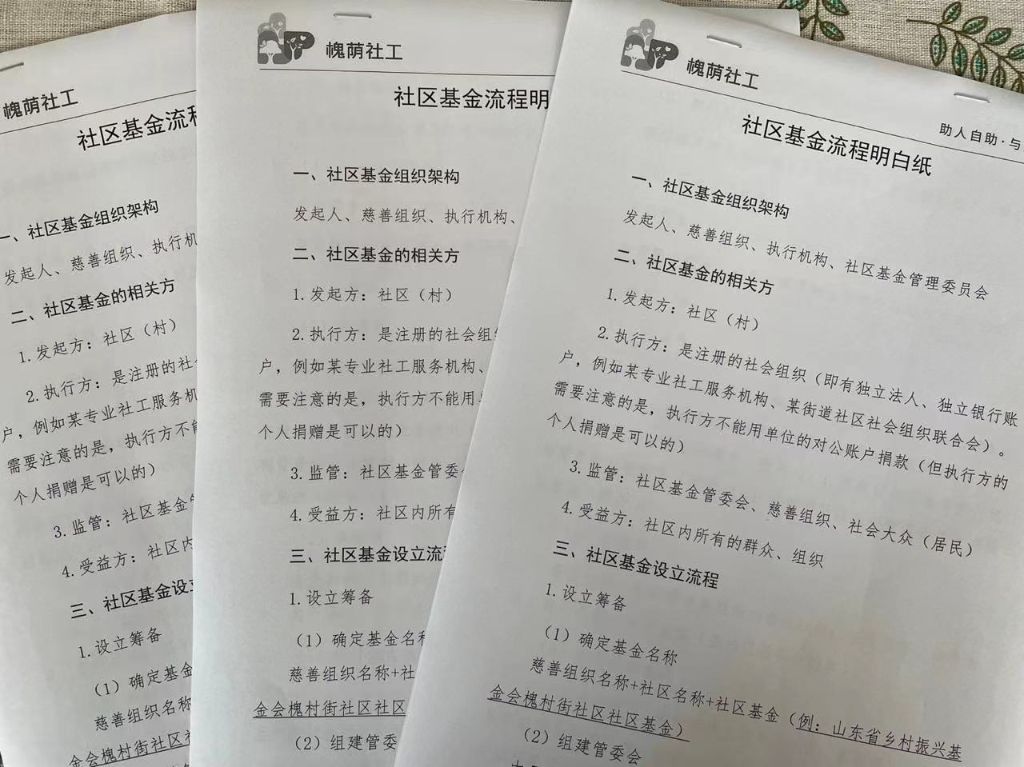 对于营市街街道的各社区来说,社区基金并不是一个陌生的事物,但是对于具体的申请与设立细节,大家还有诸多疑问。社工站将疑问进行整理汇总,将每一步申报流程进行细化,制作了大家看得懂、好明白的“社区基金流程明白纸”,其中包括讲明社区基金的相关方、设立流程、运行管理等问题。旨在引导社区提升认知,高效、快速熟悉社区基金设立流程。