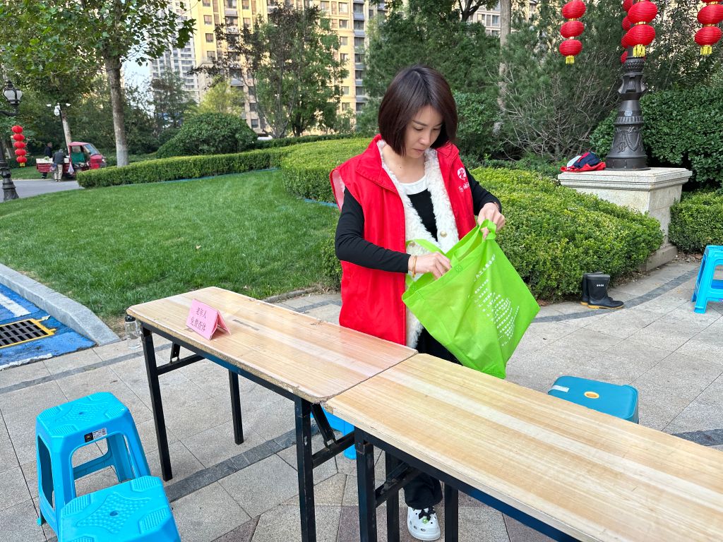 社工协助社区卫生服务站布置活动现场