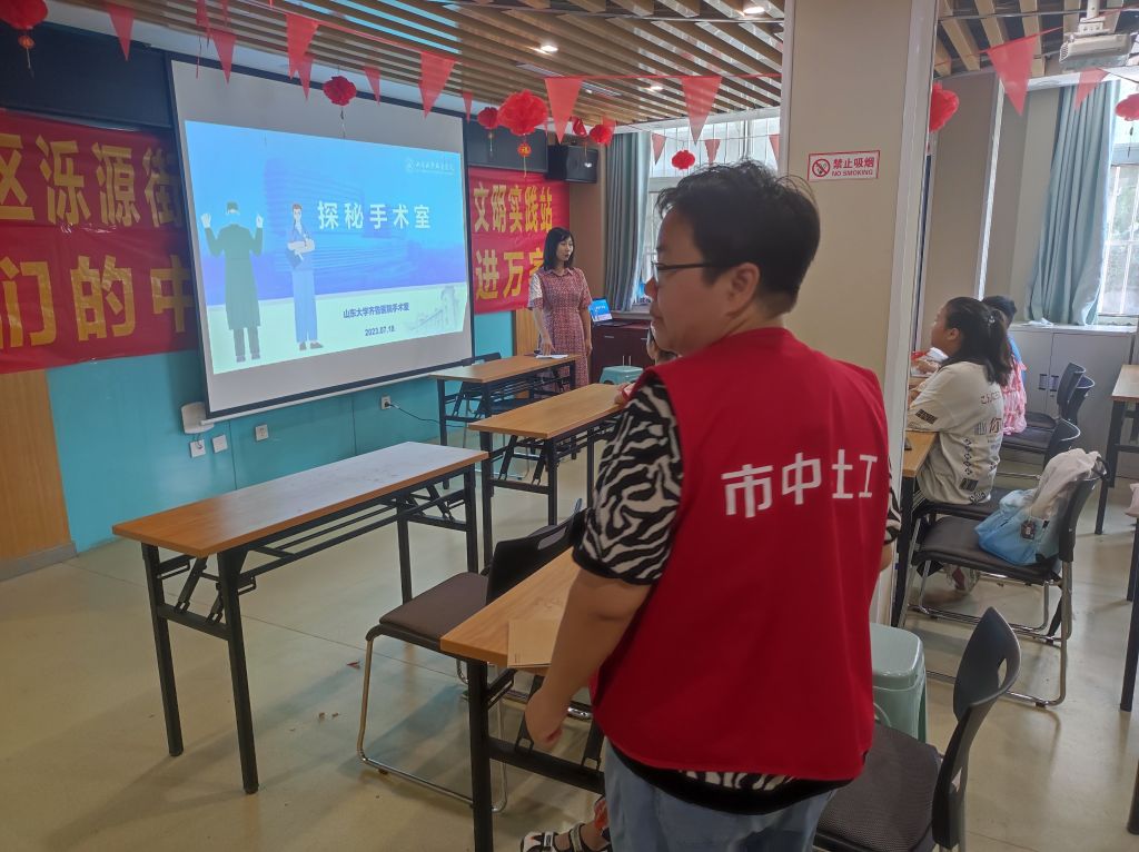7月18日,泺源街道社工站联合青年西路社区邀请了齐鲁医院健康科普团队为暑期班的孩子们带来一场不为人熟知的宣讲——探秘手术室,解惑了孩子们对手术室的神秘。本次主讲人由手术室护士长房雅婷担任。