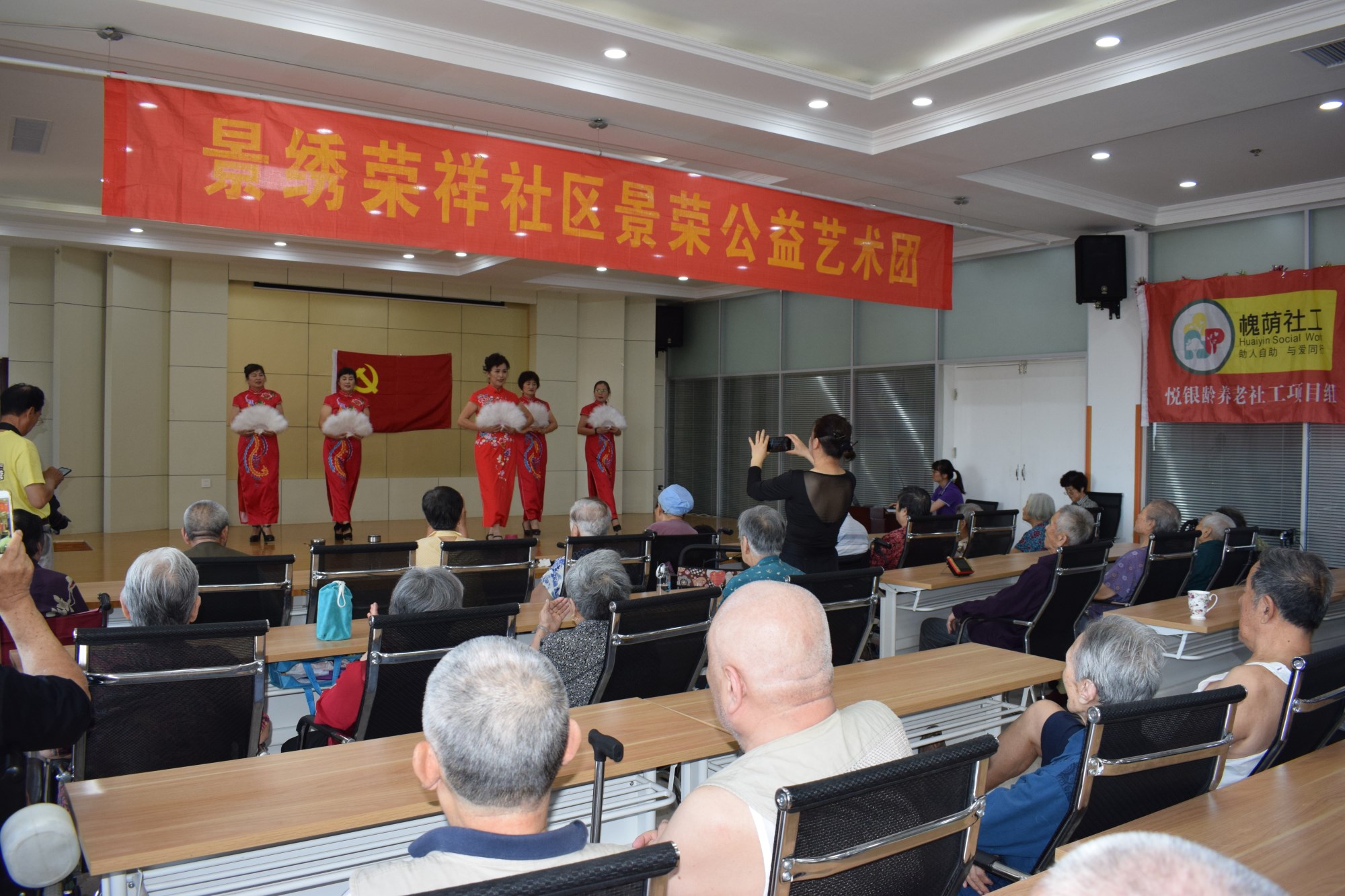演出活动形式丰富多彩,整齐划一的群舞、或嘹亮或婉转的独唱、韵味十足的二胡独奏与京剧、热情奔放的伦巴舞、婀娜多姿的旗袍秀,再加上萨克斯齐奏。整台节目异彩纷呈,让人挪不开眼,台上演员卖力表演,台下老人掌声雷动,演出最后,演员和老人们合唱《没有共产党就没有新中国》,其乐融融。