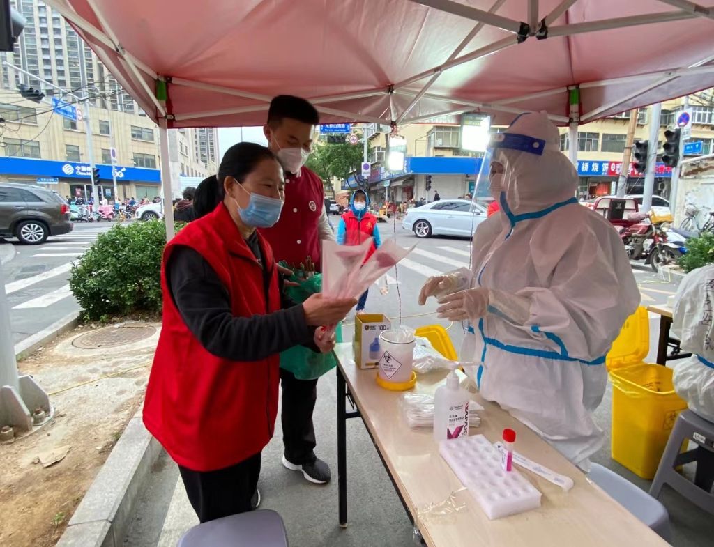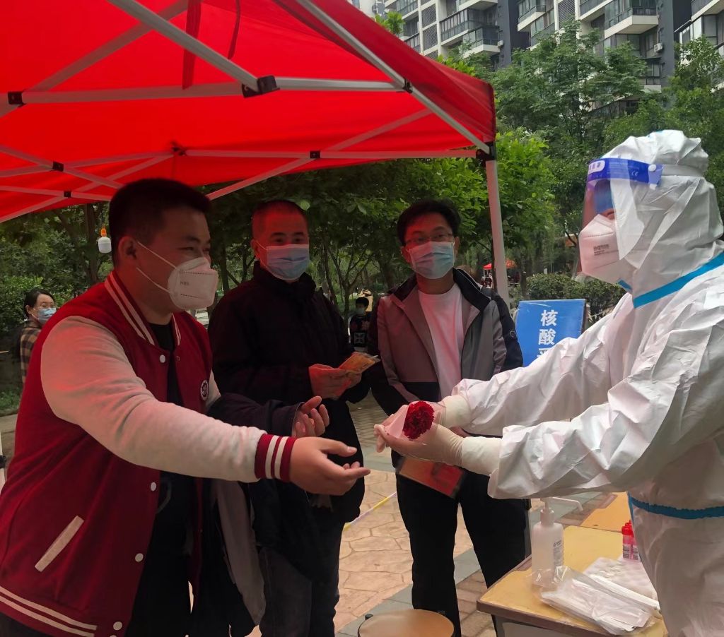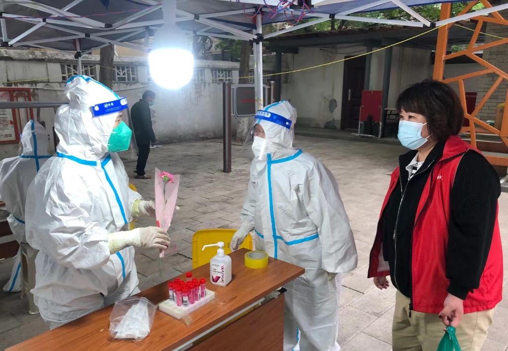 核酸检测现场,医护人员已经在岗位上忙碌着,社工为医护人员送上写满祝福卡片的鲜花,向他们致以节日的祝福和问候,向他们表达崇高敬意和感谢。在医护人员工作间隙,社工与他们亲切交流,询问日常防疫工作情况,同时考虑到长久以来抗击新冠疫情带来的身心压力,社工还为大家讲解了一些缓解压力的小方法,并表达向他们学习甘于奉献、无私无畏的精神,更好地服务于辖区居民。