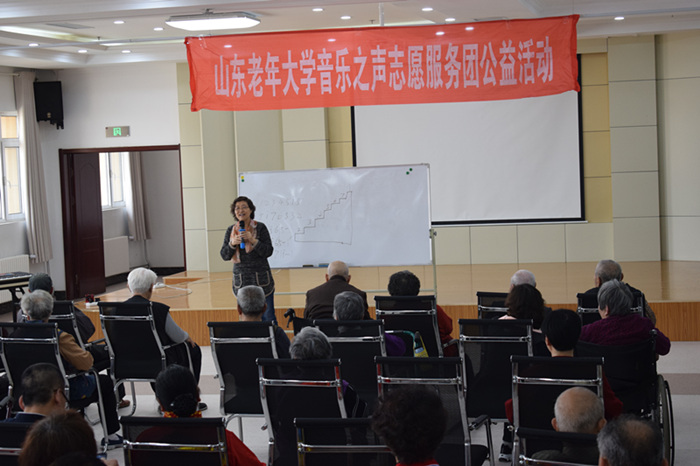 下午2:30,活动正式开始,首先由山东老年大学音乐之声合唱团团长史向阳老师为老人进行声乐培训,史老师在正式培训前带领老人开嗓,以保护老人的嗓子。开嗓完毕后史老师便讲解和教授老人如何发声以及如何更好地发声,台下的老人和社工以及表演者都认真的学习和练习。之后史老师与老人一起回顾了上一期的歌曲《我们的生活充满阳光》,老人的歌唱也得到了史老师的表扬,老人也美在心头,笑在脸庞;最后史老师便教授这一期培训的歌曲《花非花》,其歌词来自于唐代诗人白居易的一首诗,歌曲简单易学,典雅精致,旋律优美顺畅,音色柔美抒情,略带浪漫色彩。“花非花,雾非雾,夜半来,天明去···”伴随着柔美的歌声结束了此次培训。