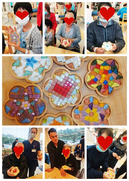 4月23日下午,第一次活动在康复中心西厅顺利举行。社工向康复患者介绍了开设小组的目的和意义,以及第一个手工——五彩杯垫的制作要求和制作流程。在社工和康复治疗师的协助和陪伴下,十余位康复患者和家属按步骤一一操作,涂胶、设计花样、粘贴马赛克装饰,虽然手工操作比普通的手指训练难度大一点,但康复患者非常耐心且专注,一番细致地操作过后,将杯垫点缀地五彩斑斓,顺利完成了第一步任务。