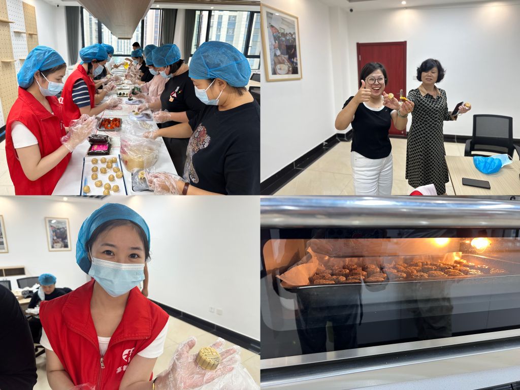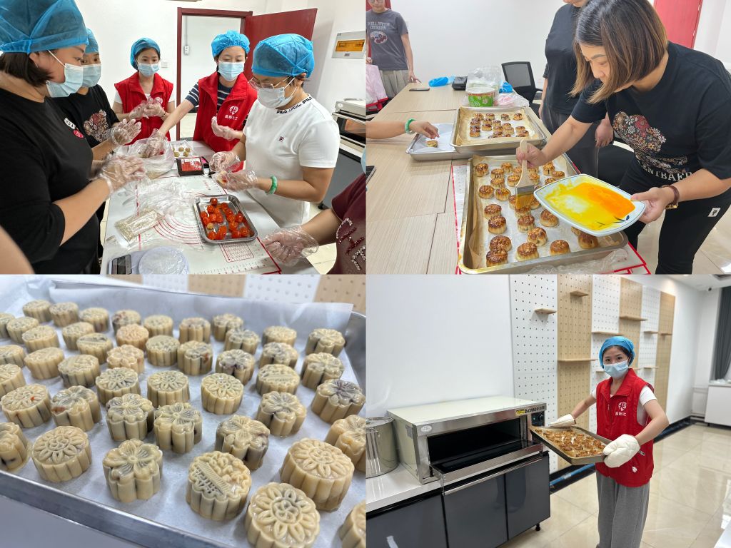 制作过程中,大家相互交流,欢声笑语不绝于耳。有的和面,有的制馅,有的则负责将馅料包入面皮中并放入模具中成型。虽然刚开始时都有些手忙脚乱,但随着时间的推移,大家逐渐掌握了制作技巧,经过揉面团、压皮、包馅、压模、脱模、烘烤等程序,一个个漂亮的月饼在他们手中诞生。然后,进入烤箱烘烤。