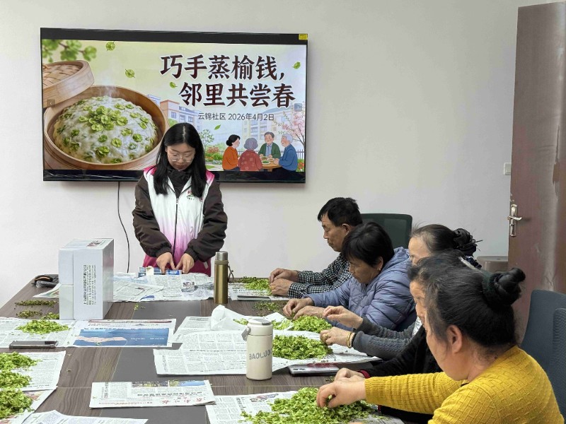 活动现场暖意融融,社工与居民们围坐长桌,分工协作、忙而有序。大家在社工的引导下仔细摘选清洗鲜嫩榆钱,剔除杂质,再将榆钱与面粉、玉米面按比例混合,揉搓成软硬适中的面团,随后捏出中空的窝窝造型。翠绿的榆钱与谷物相融,一个个饱满的窝窝整齐入屉,随着蒸汽升腾,清香瞬间弥漫整个活动室。热腾腾的榆钱窝窝出锅后,居民们围坐品尝,蘸上现捣的蒜汁,一口咬下是春日的清甜,更是满满的童年回忆。大家一边分享美食,一边闲话家常,邻里间的距离在欢声笑语中悄然拉近,现场氛围温馨融洽。