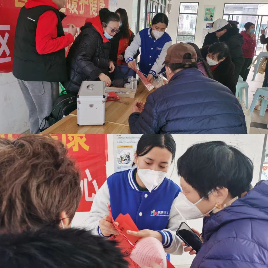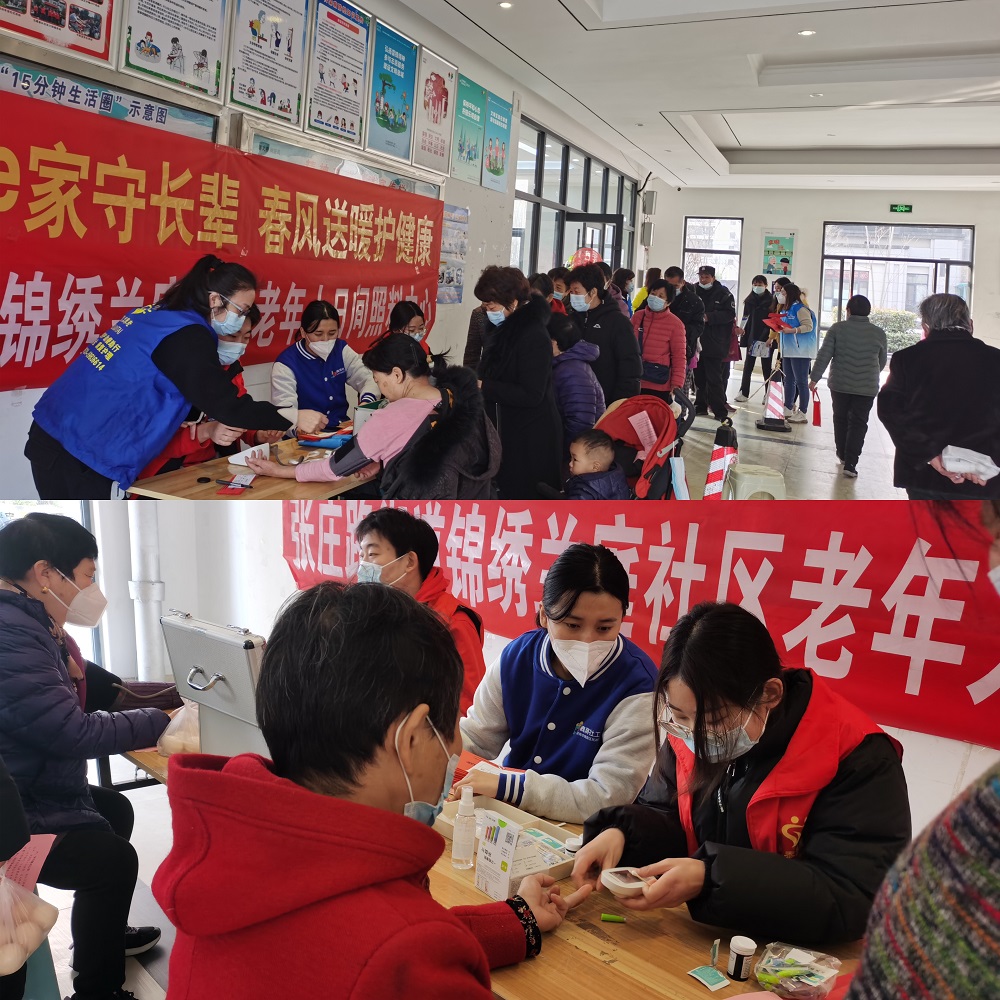 为了提高长者对自身健康的关注,及时了解自身健康状况,也为了提高社工服务的专业化水平,张庄路街道社工站联合锦绣兰庭社区居委会以及泉泰百居养老机构在2月28日上午举办免费测量血压、血糖、血氧饱和度以及心率等长者健康查体服务。本次活动服务社区80余人。