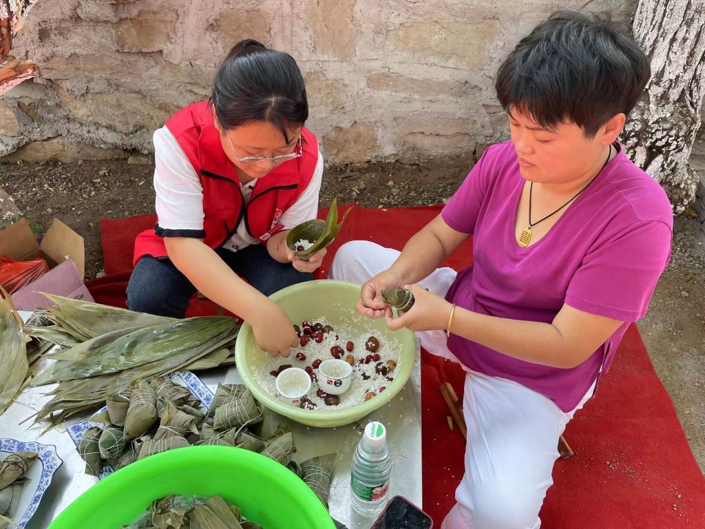 过端午必然少不了包粽子这一活动环节。准好包粽子的食材,社工和村民将糯米与红豆反复洗净浸泡,确保食材的干净与卫生。粽叶也是提前过水煮开,清洗备用。一个个的小粽子就成型啦。