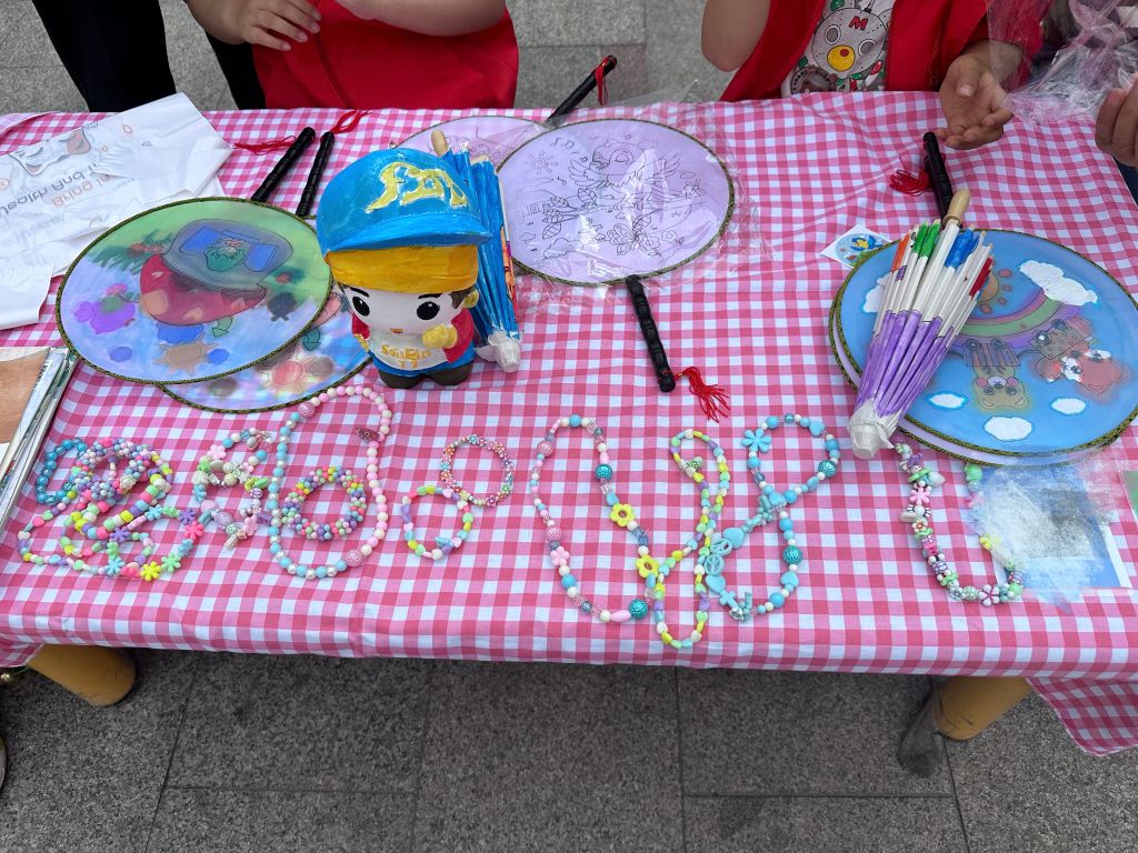 精心策划准备,招募爱心伙伴。为了活动能顺利开展,社工在前期做了很多准备工作,活动当天要义卖的“商品”一部分是康复中心的孩子们制作的,虽然他们动作有些慢,但孩子们都很认真,作品也很精致。前来购买“商品”的人们,都被他们的心灵手巧所折服,被他们乐观面对生活的精神所感动。而另一部分来自爱心人士的捐赠,社工和志愿者在前期进行大量的宣传,呼吁爱心家长带领自己的孩子积极报名参加。活动现场,有20多名小小志愿者参与进来,他们纷纷拿出看家本领,桌子上摆满琳琅满目的“商品”。女孩们编了好看的手串项链,画了好看的雨伞;男孩们做了风筝和扇子等。