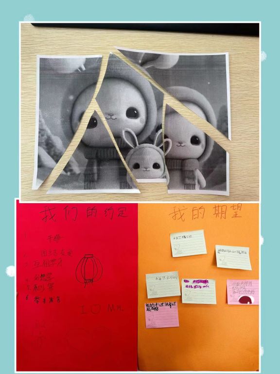 活动开始之前,6名小组成员依次签到,活动开始,社工首先为组员们讲解了本节小组活动的目的。接着,社工带领组员们进行破冰—拼图游戏以及有奖问答,游戏过程中,在社工的引导下,组员从刚开始互相试探或者保持沉默,到后来慢慢打开自己,通力合作,完成拼图,社工也时刻注意组员的反应,通过引导消除组员间的紧张感、陌生感,促进组员的融入。游戏结束后,组员与组员之间相处更加放松、融洽,组员与组员之间、组员与社工之间互动性也有了明显的提高,营造了良好的沟通氛围。接下来,社工引导组员头脑风暴制定小组契约,组员通过积极思考,民主选取红色卡纸,组员们认真讨论后写下并且装饰“我们的约定”板,社工将其贴在较为显眼的地方,引导、督促组员认真遵守。在动手制作小灯笼环节中,社工积极回应组员需求,引导组员说出自己的喜好,比如喜欢什么颜色等,加深组员间的了解的同时,也锻炼了组员的动手能力。最后,社工分享开学前收心小窍门,组员写下对未来的期待,在欢声笑语中,本节活动顺利结束,组员们填写活动意见反馈表,评价均为满意,并期待与社工们的下一次见面。