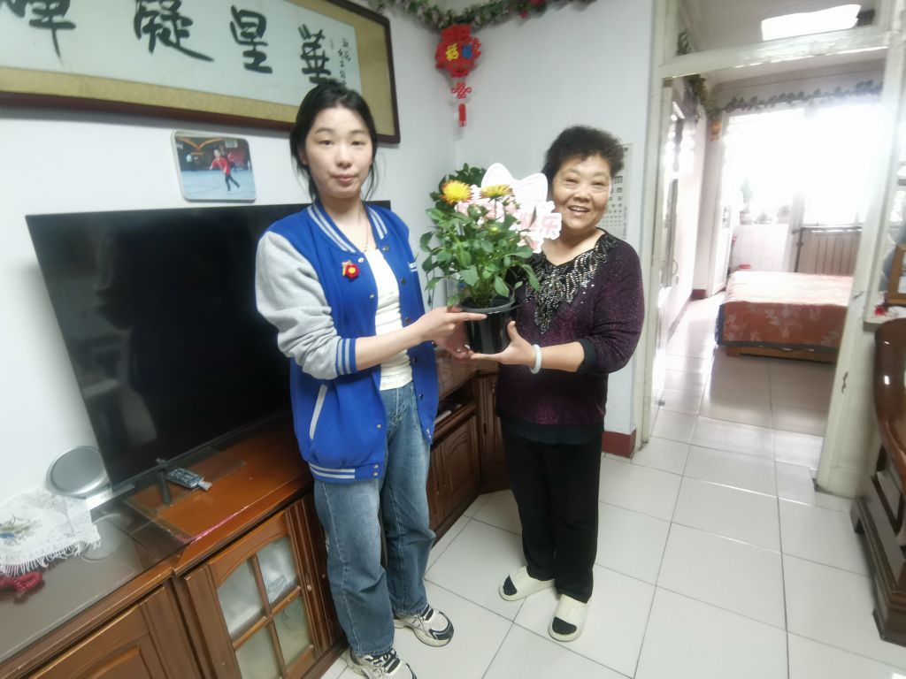 走访前,社工明确入户对象,包括高龄独居老人、辖区志愿者及社区社会组织骨干,通过电话的形式准确了解其居住地址及到访时间。走访时,社工将提前准备好的鲜花盆栽送给各位母亲,并详细询问她们的日常生活起居情况及身心状况,为其递上真心的祝福。