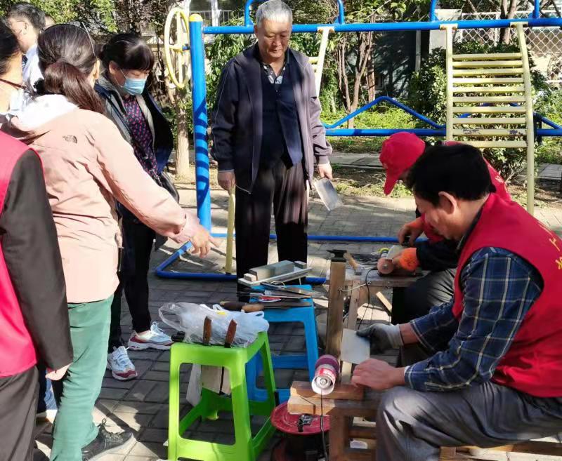 理发师志愿者和磨刀志愿者根据居民的需要,运用娴熟、精湛的技术,细心地为每一位居民修剪头发和磨菜刀,得到路过的围观群众一致好评。