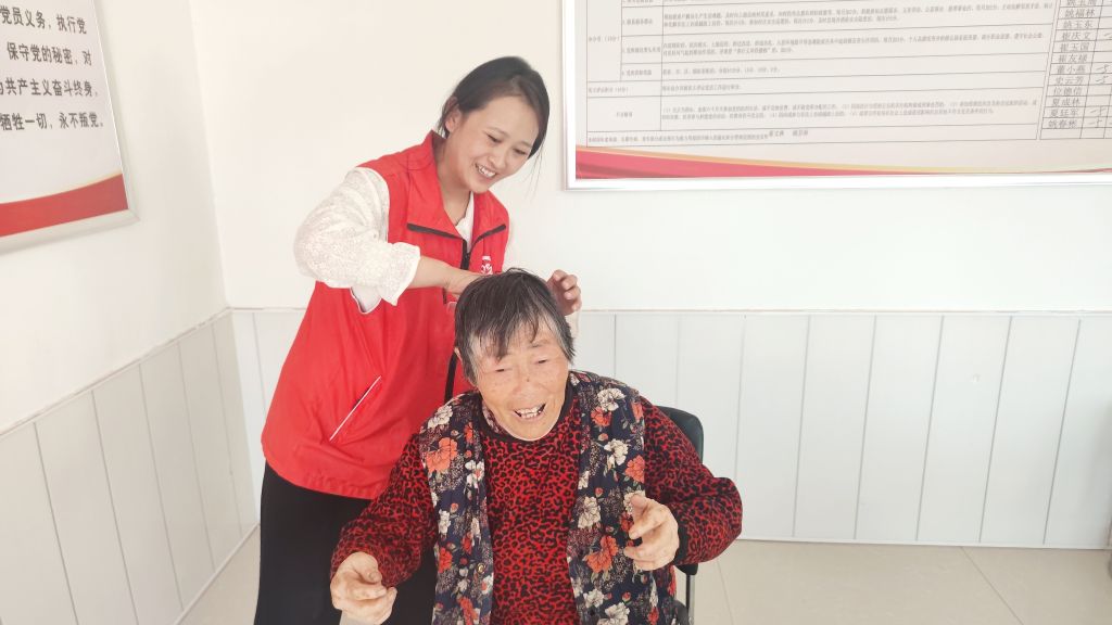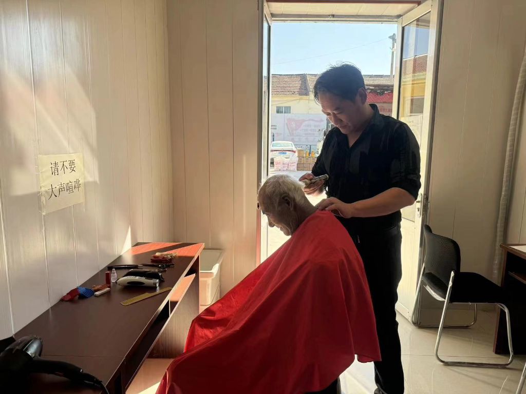 表演结束后,志愿者和志愿者带着专业的理发工具,仔细的询问每一位老人的理发需求,并与他们亲切交谈,详细了解他们的生活起居、健康状况和护理照顾等情况,耐心叮嘱老人要保重身体,心情愉悦,乐享生活。理完发后老人们容光焕发,社工帮助老人整理衣领,梳理头发,引导老人挺胸抬头、微笑,准备拍摄照片。老人们对社工和志愿者的到来表示很开心,幸福的笑容挂在脸上,现场充满着欢声笑语。