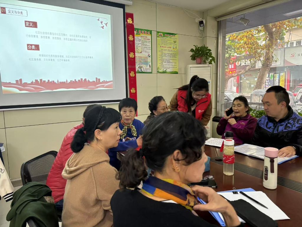 培训会上,社工首先详细介绍了此次培训的目的,旨在更好地推动社区社会组织发展,为社区建设贡献力量。紧接着,社工带领大家梳理社区社会组织的定义、类型,并结合各社区社会组织的具体情况和遇到的具体问题,讲解了社区发展社区社会组织的必要性及社区社会组织的发展现状和意义。
