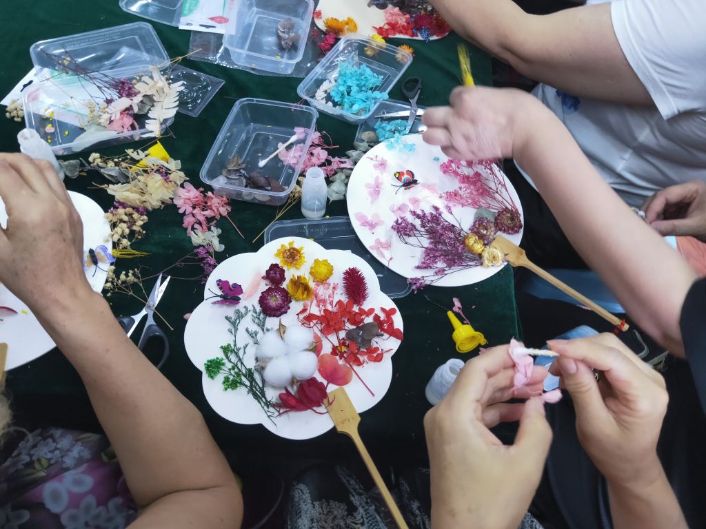活动开始,社工首先向残疾人介绍了中国的扇文化,团扇是中国传统手工艺品,具有极高的艺术价值,凝结中国传统文化内涵,象征团员美满之意。随后,社工讲述了干花团扇的制作过程和技巧,指导大家运用自己的创意和想象力,将干花细心黏贴在扇面上,经过妙心巧手的装扮,素白的扇面逐渐被点缀,一副副独具风采的团扇作品呈现在眼前,现场气氛活跃,其乐融融。