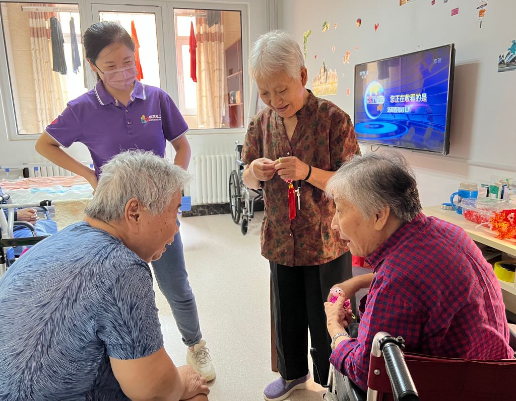 “你串得这条龙真的是太好了,尤其是这个龙头,太像了,真是霸气威武。”“你串的这个圣诞老人也好看,小巧精致,还是双面的,你的手艺也不赖。”今天下午,李奶奶的房间里,你一言我一语的互相夸赞对方的作品,尤其是对李奶奶的手艺赞不绝口。社工的一句“李奶奶串得这些宝贝都可以在咱院里摆个摊儿来卖了,绝对有不少老人喜欢。”引得老人们哈哈大笑。这是槐荫区社会福利服务中心院舍化生活的一角。