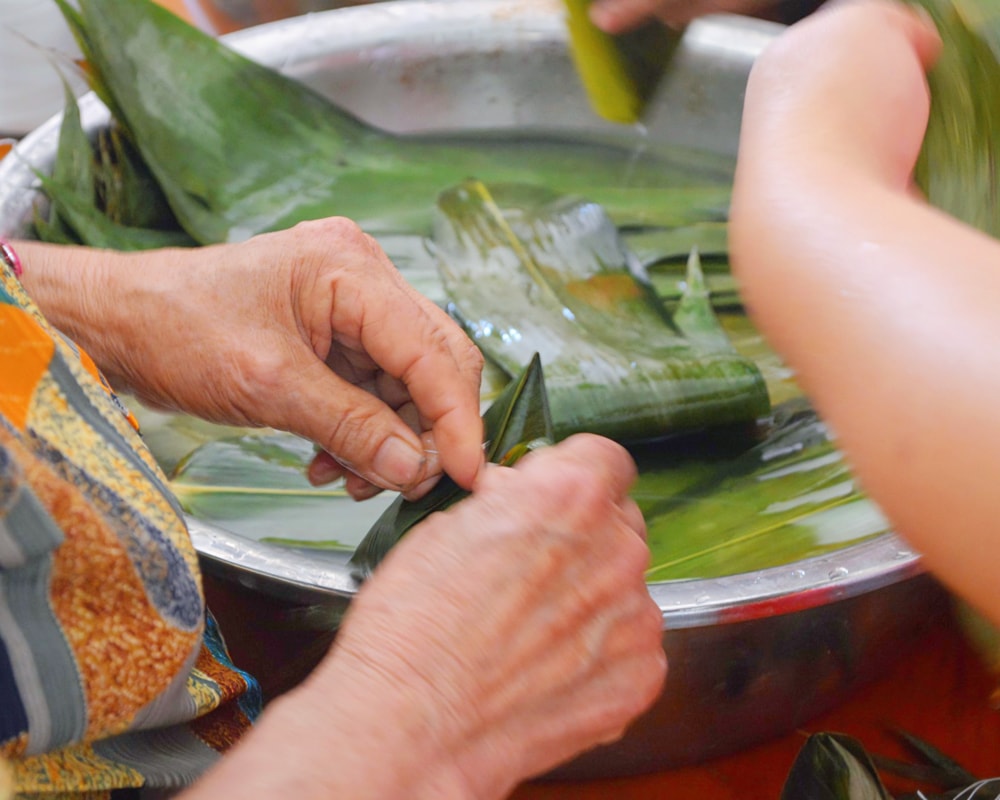 活动后期,社工、志愿者与老人们一起围在桌旁,忙碌地准备粽叶、江米、大枣等材料。社工们也都是第一次包粽子,在志愿者的协助和指导下,大家有序地洗粽叶、包江米、绑绳结,一个个饱满可爱的小粽子在大家手中诞生,大家兴致勃勃,整个活动现场欢声笑语不断,在大家的共同努力下,一片片粽叶变成一个个碧绿飘香的粽子。