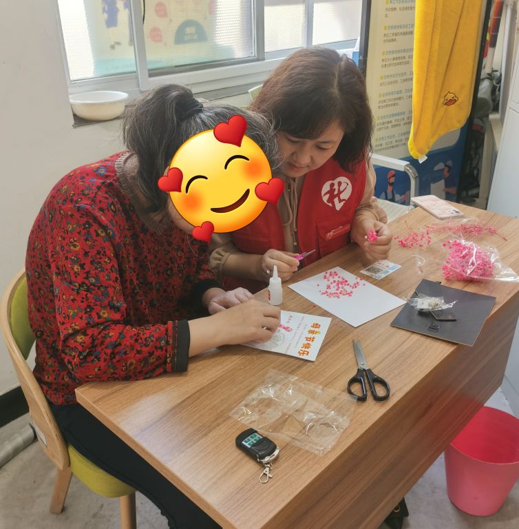 母亲节当天,社工和服务对象杜老师一起来到社工站,当打开将要为妈妈制作的夜灯相框的时候,服务对象忐忑的说到到:“我能行吗?我可能不行吧,我看着挺难的制作的。”这时在一旁的社工小李立即运用心理社会治疗模式中的直接治疗技巧,微笑着鼓励道“你可以的,这难不倒你的,要相信自己,勇敢的迈出第一步,接下来一切就会很顺利的,如果遇到困难,就寻求志愿者的帮助,她会协助你的。”在社工的不断鼓励下,杜老师也鼓起勇气,勇敢的尝试起来,涂上一点胶水,拿着小镊子将一朵朵永生花小心翼翼的均匀平铺在最美的“妈妈”上面,顺序排放,然后将深夜照亮妈妈起夜安全的闪光灯精心布置在周围。经过一个小时的不懈努力服务对象完成了送给妈妈的母亲节礼物。社工也深深的感受到了服务对象通过此次手工制作在完成自我挑战之后的满足感与自豪感。