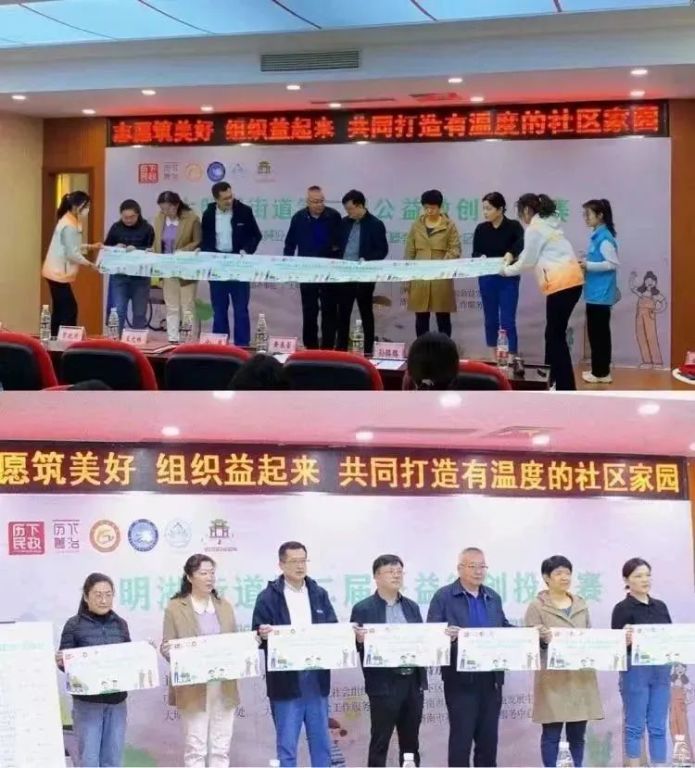 王文林局长、于晓东科长、黄春蕾教授、金勇主任、高丽华科长、孙璐璐主任,李明叶总干事共同上台剪彩,大明湖街道第二届公益微创投大赛正式启动。
