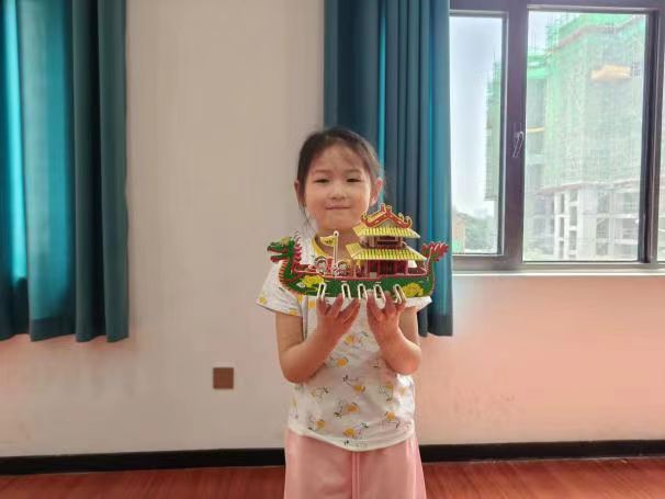 本次活动由叙端午、拼龙舟两个环节组成。活动现场,社工先向大家讲述端午节包粽子、赛龙舟的由来,让孩子们对端午节有一个更加清晰的认知,随后,现场工作人员为孩子们发放手工材料包,详细讲解制作龙舟的步骤和需要注意的事项。拿到材料包后,孩子们和家长按照图纸将眼睛、龙须、龙鳞等零件粘贴到龙舟上做装饰,用多余材料给龙舟进行改造,经过孩子们和家长的装饰,一个个龙舟成品呈现在大家眼前。“很开心,既动脑又动手,还能通过制作龙舟了解更多的中国传统文化。”参加的小朋友拿着自己一个多小时做成的成品,高兴地说道。