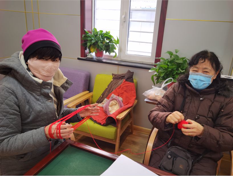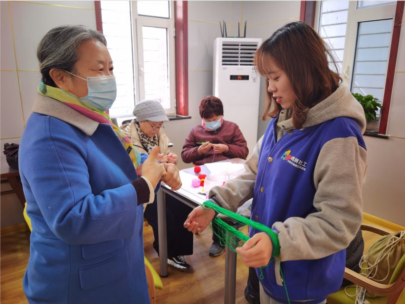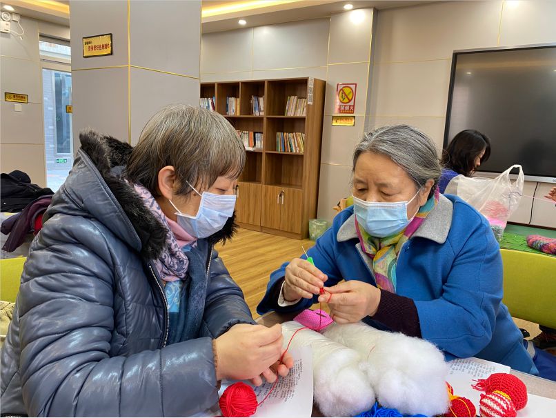 活动现场,编织班的社工把编织灯笼的材料发到每位居民手中,接着,编织班杨老师一边示范一边向大家详细讲解了灯笼编织的步骤,在杨老师的指导下,大家积极的翻动起手中的钩针来。“杨老师,3个短针,1个减针,后边全是2并1,口诀对吗?”耳边传来居民们在编织的过程中热切求知好学的询问声,居民们相互帮助、相互学习,其乐融融。