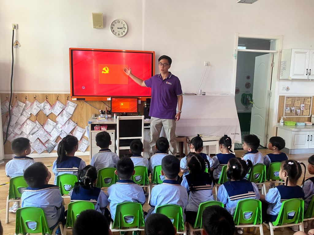社工通过ppt的形式为孩子们讲解党史及党旗含义
