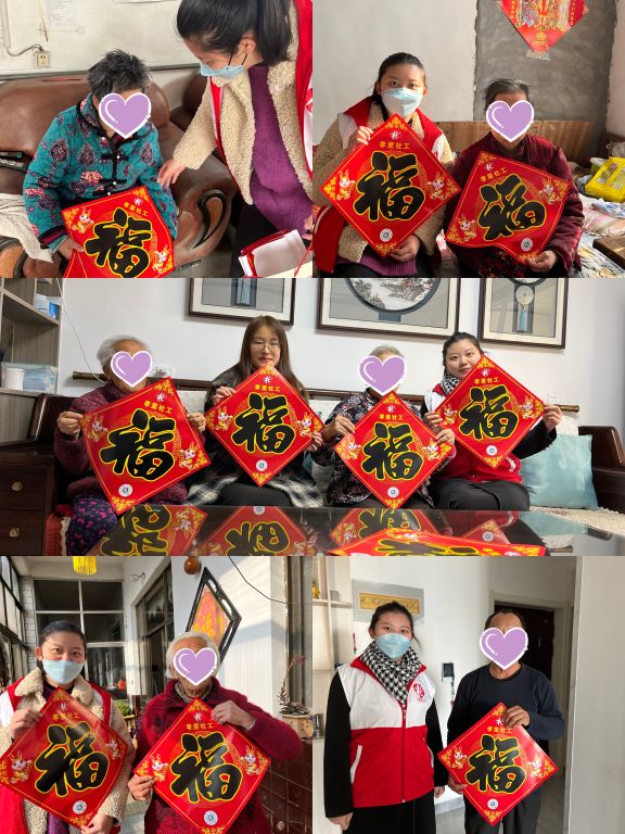福·关爱老人 敬老人促和谐,助老人传文明,爱老人暖民心。孝里社工关爱辖区空巢老人,带着福字门贴走访孝兴家园和广里店村的空巢老人群体,为他们送去新春祝福。社工与老人亲切交流,检查家庭有无安全隐患,叮嘱用电用气安全,特别提醒春节防诈,教授老人使用智能手机为亲朋好友发送新年祝福,老人们纷纷表示“真是帮了大忙了”、“谢谢你们我一定注意放心放心”。社工带来的福字门贴也被老人们妥帖保存,“过年贴在大门最显眼的地方”。