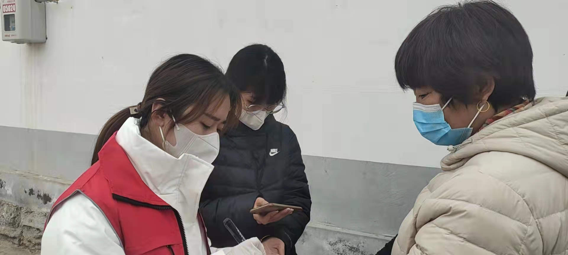 在开展核酸检测的过程中,村委通过广播提前告知居民带好身份证,社工及志愿者们维持队伍排队秩序,为接种者填写顺序码,并协助不熟悉手机操作的居民如何查看健康码,以此提高核酸检测的效率。