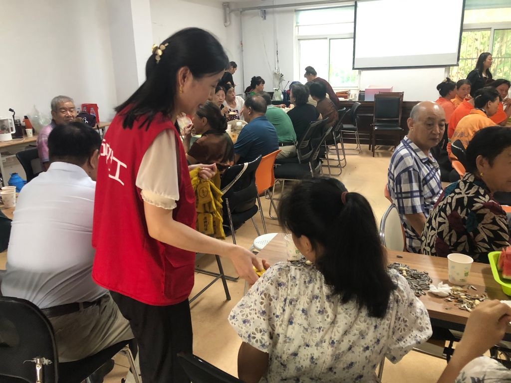 活动伊始,社工组织前来参加活动的居民们在门口签到,然后安排大家纷纷入座。叔叔阿姨们你一言我一语都对活动充满了期待,社工贴心的为大家准备了酸梅汤、西瓜、瓜子、花生等食物。