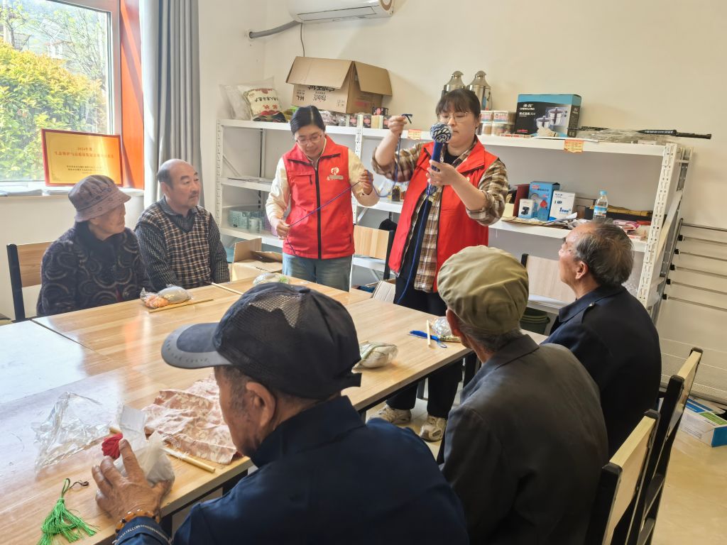 接着,社工现场示范养生锤的制作流程,每一个环节都讲解得详尽周到,从选择布料、填充艾叶到安装手柄等。有的老人戴上老花镜,拿起材料,在社工耐心的指导下开始了养生锤的制作。在制作过程中,老人们展现了他们的动手能力和创造力。有的老人手法熟练,缠线均匀,很快养生锤的雏形就呈现出来;有的老人虽然动作稍慢,但眼神中透露出专注和认真,遇到问题时会主动向社工或同伴求助。大家一边制作,一边交流养生经验,分享生活趣事,现场气氛既热烈又和谐。经过一个多小时的努力,老人们手中诞生了一个个散发着艾草香味的养生锤。看着自己亲手制作的养生锤,老人们脸上洋溢着自豪和满足的笑容。77岁的孙大爷兴奋地说:“这个活动太有意义了,不仅让我学会了制作养生锤,还能在家自己使用它进行按摩,真是太实用了。和大家一起动手制作,让我感觉回到了年轻时代,非常开心。”