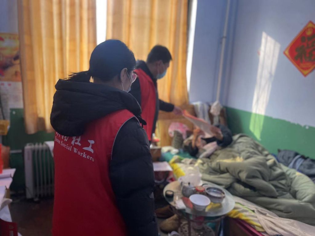 开门迎福。面对社区内无法下床的刘大爷,社工和志愿者一起走进了大爷家中。大爷看见社工后第一句话就是“我这一把年纪了除了儿女还有你们想着我,真的是太感谢了你们了,闺女。”简短的一句话,深深地表达了社工和困境群体的真挚情谊。社工与大爷亲切交谈,认真倾听他的心声,并主动为老人打扫卫生,提醒老人注意身体,并约定好明年开春再来看望刘大爷。送福进家门,不仅仅是进入寻常百姓家,更重要的是进入困境群体的家,一副“福”字链接的不仅仅是新春的美好祝愿,更是关怀弱势群体的有力环节。