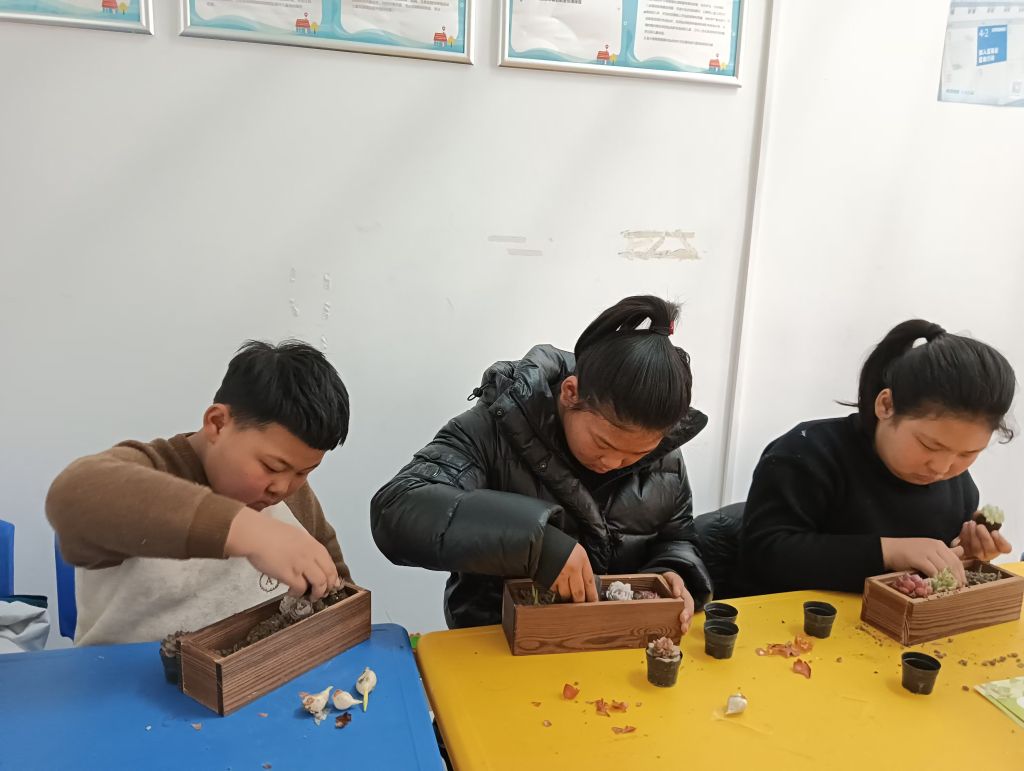 种植绿植是本次活动的核心环节。社工详细讲解了绿植种植的注意事项和步骤,从如何选择花盆、种植土,到种球的种植深度、浇水的频率等,每一个细节都讲解得十分到位。孩子们在社工的指导下,亲手种下郁金香种球和多肉植物,体验植物生长的魅力。在这个过程中,孩子们不仅学到了种植知识,还感受到了大自然的神奇,培养了对自然的热爱和保护意识。社工时刻关注着孩子们的操作,确保他们的安全,同时鼓励孩子们相互交流、相互帮助,增强了孩子们的团队协作能力。