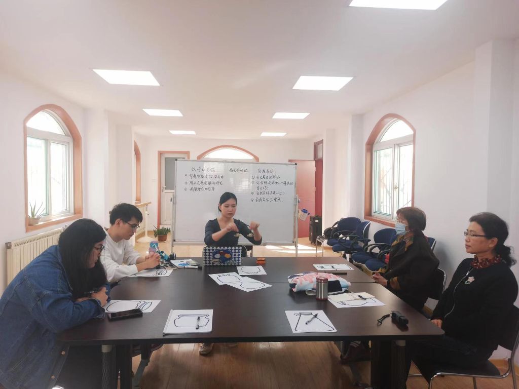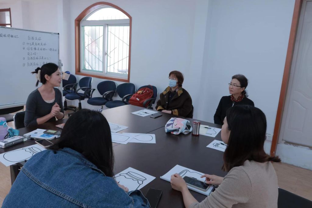 在练习结束以后,小组组长引导大家讲述练习的感受。大家积极的分享这一次正念冥想的奇妙体验。大家纷纷表示这是有温暖、幸福感的一次练习。孔老师提到:“老师引导握住小拇指的时候,我想到了侄子新添了的小宝宝,就像小拇指这样一样需要被包裹着,去呵护,我感觉这个体验还蛮奇妙的。”